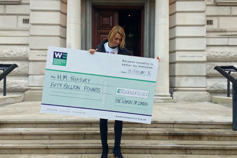 On the morning of February 18, party leader Sophie Walker stood before Her Majesty’s Treasury, the finance ministry, with a cheque for this amount, representing the money lost due to “women’s untapped earning potential”.