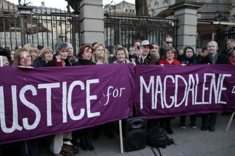 ![A woman holds a poster in solidarity with Justice for Magdalene Survivors in Dublin, Ireland, in 2013, prior to Prime Minister Enda Kenny's apology on behalf of the Irish people for ignoring the conditions at the laundries between 1922 and 1996. [Peter Morrison/AP]](https://www.aljazeera.com/wp-content/uploads/2016/03/65e6ef576da24e77aa16118cd203cc93_18.jpeg?quality=80)