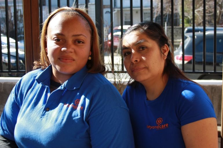 Morales and Muñoz technically have the day off from work and are spending it each with her young child – a couple of strollers are parked directly in front of the two women, both in their 30s – but they are also attending a meeting with Beyond Care’s lawyer later this afternoon.