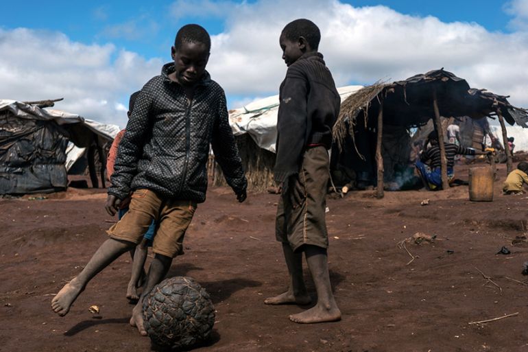 Children kick a football across the dark, red earth, while their elders sit outside the makeshift homes, talking, feeding babies or grinding maize.
