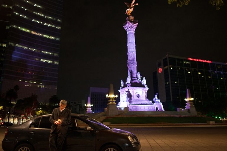The city’s iconic Angel of Independence monument is lit up as the car slows to a halt on the empty roundabout. We get out.