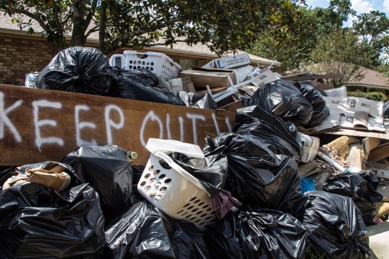Baton Rouge, United States – Beyond an immense mound of destroyed belongings and rotting wood sitting in the yard across from her home, Mary Mercado puts out food and water for her neighbour’s cat.
