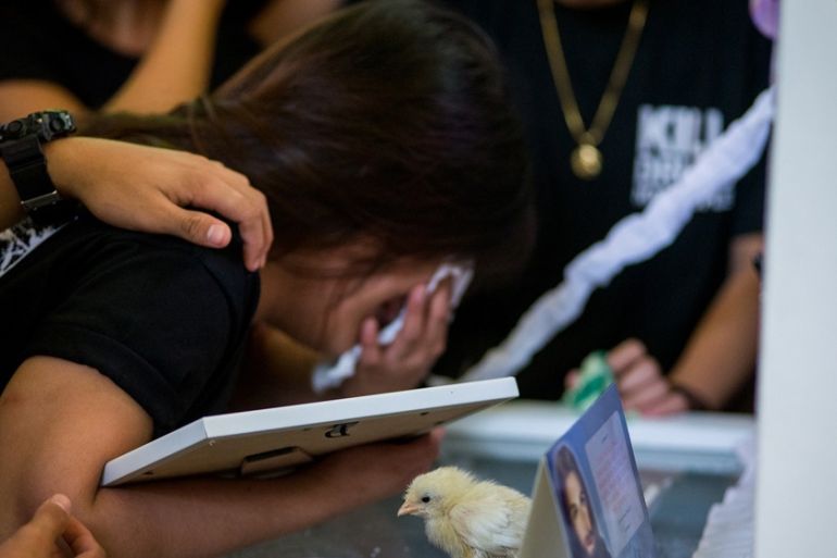 Sison’s partner Bermoy kept vigil, watching a white chick on top of the Perspex of the coffin lid hopping among grain flecks. “The chick is a symbol of justice,” she said. “So that the death pecks at the conscience of his killers.”