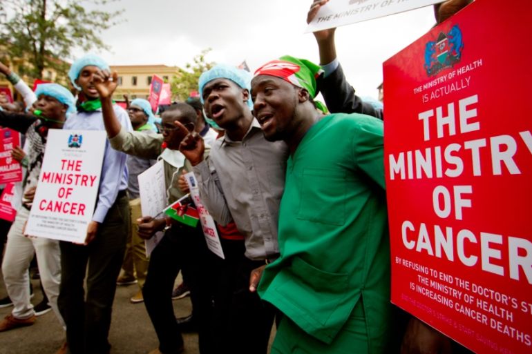 ![On January 31, outside the courthouse in Nairobi which is deciding whether doctors may continue their strike, doctors carried signs blaming the health ministry for the untold number of patients who aren't receiving treatment as the standoff between the medical union and the ministry drags on. [Jacob Kushner/Global News Insight]](https://www.aljazeera.com/wp-content/uploads/2017/02/da3543bd052e47d69b17f17010976261_18.jpeg?quality=80)