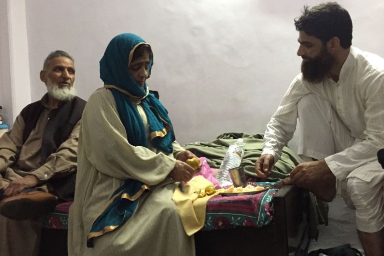 His mother, Mehmooda, 68, sits close to him, wearing a pheran, a traditional Kashmiri dress, and a green headscarf.