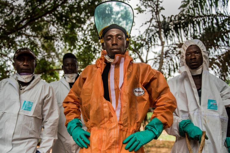 Freetown, Sierra Leone – A group of young men wearing protective suits and face masks pace the riverbanks looking for body parts.