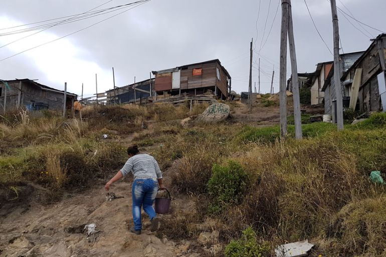 Soacha, Colombia – Navigating a steep slope with a bucket of water Rosa Fierro is careful not to spill a single drop of her precious cargo.