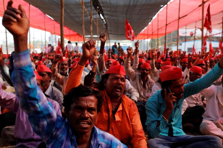 Farmers shout slogans against the government at a rally in Mumbai [Danish Siddiqui/Reuters]