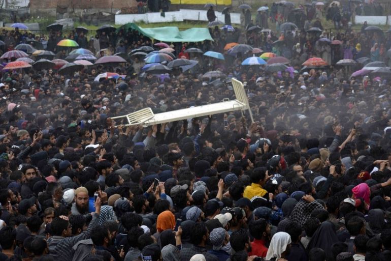 The bodies of Kashmiris killed by the Indian armed forces are not taken to the graveyard in a closed coffin. They are considered heroes or martyrs and are often carried out on metal beds or stretchers – taken from the hospitals where families have gone to identify them – so everyone can see them.