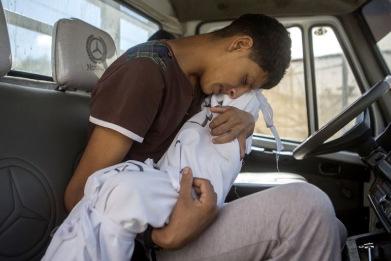 “This photo marked the moment my life ended. She stayed in my arms until we buried her,” said 18-year-old Mohammed Maadi one year after the Israeli bombing in which six members of his family were killed.