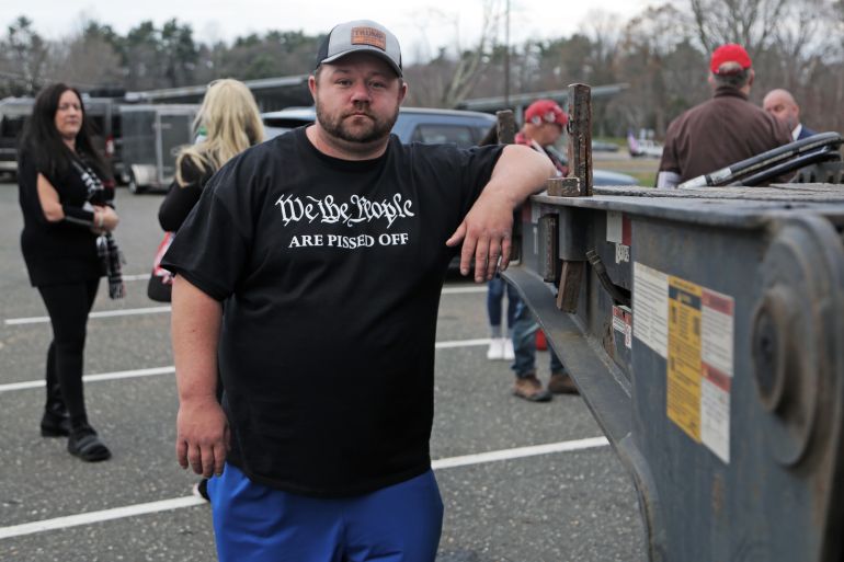 Hauppauge, New York – “Keep America Great” flags rippled in the wind. One woman clung to a cardboard cutout mask of United States President Donald Trump’s face. QAnon believers, far-right militia supporters and anti-vaxxers mingled.