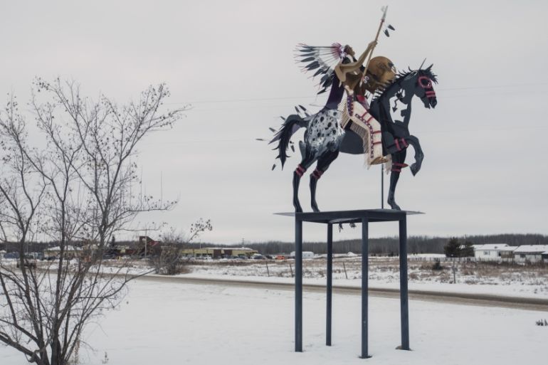 A sculpture stands on the snowy grounds of Saddle Lake Cree Nation in Alberta [Amber Bracken/Global News Insight]