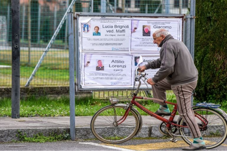 An elderly man riding a bicycle looks at funeral posters displayed outside the small cemetery of Bolgare, Lombardy, on March 23, 2020 during the country's lockdown [Piero Cruciatti/AFP]