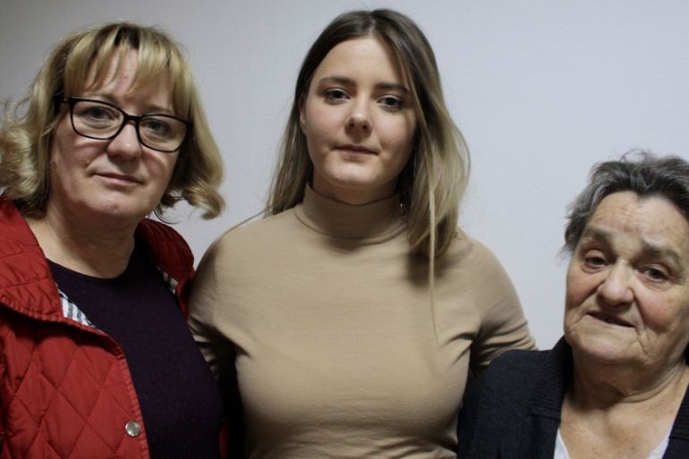 Emina, now 27 years old, is sitting between her mother and grandmother quietly. Unlike her brother, who was three at that time, Emina never had the opportunity to meet her father.