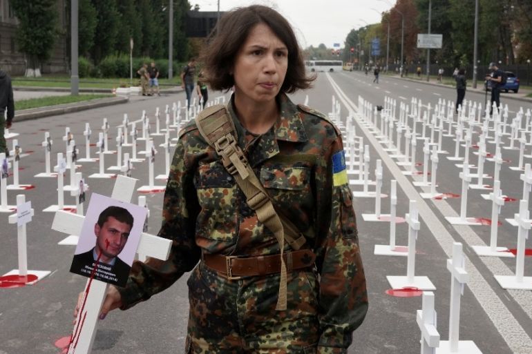 Kyiv, Ukraine – She sported a red dress, fur coat, high heels – and an AK 5-45 gun she got from her husband who died in 2014 fighting pro-Russian separatists in southeast Ukraine.