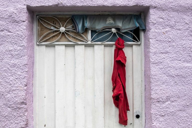 The piece of red cloth is one of many dotting the buildings of Bogota’s working-class neighbourhoods – a symbol of someone in need.
