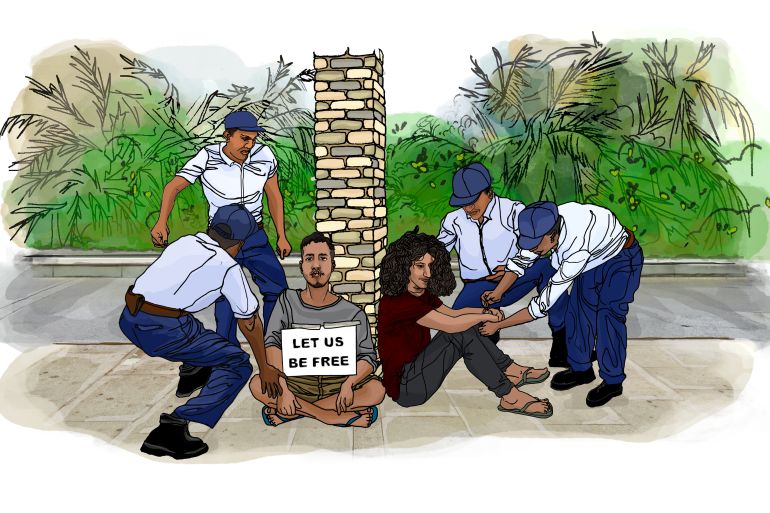 On another occasion, two guards walked towards Adnan while he was shouting and holding his sign. They called him “a dog”, says Mehdi.