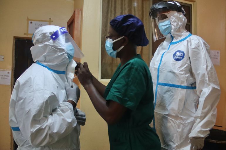 At the Lassa ward, head nurse Alabi steps out of the red zone into the station where protective gear comes off and plastic barrels are placed to disinfect footwear and face shields that will be reused. As she carefully peels off the layers, the 50-year-old shares her concerns about the future.
