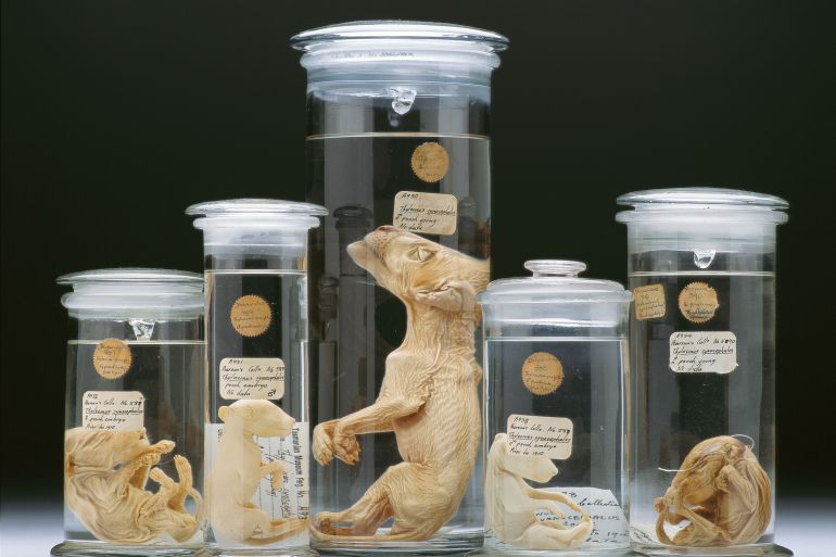 In its back rooms, away from harmful sunlight, are drawers laden with thylacine pelts – their stripes, distinct as ever, barely blemished by time, and shelves holding mounts of the creature – some eerily lifelike in the dim light. But perhaps most evocative, securely locked away, are jars of baby thylacines – known as pouch-young because they were too young to leave their mother’s pouch – their eyes yet to open, their small, perfectly formed, wax-like bodies, serenely floating in a clear solution.