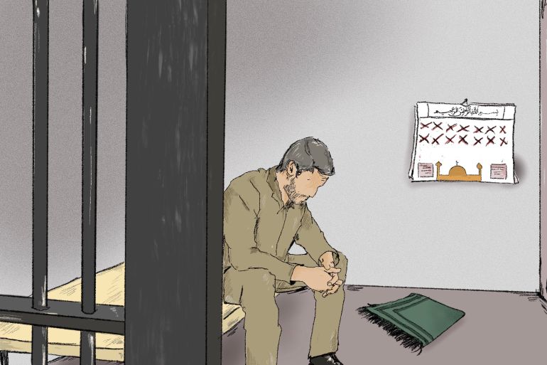 I had just gotten up to clean the floor of my South Compound cell — a single-person, 8 by 7-foot (2.4 by 2.1-metre) cage — before performing morning prayers. A long metal table runs across the length of one wall of my cell; adjoined to it are a stainless steel sink and toilet. The light grey walls are bare except for an Islamic prayer calendar, a timetable that I follow every day.
