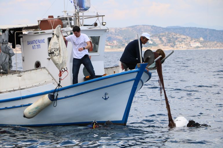 Salamis, Greece – Three divers’ heads bobbed in the sea. Then, two white balloons surfaced. Attached to them, recovered from a depth of 16 fathoms (29 metres, 96 feet), was the brown tangle of a discarded plastic fishing net.