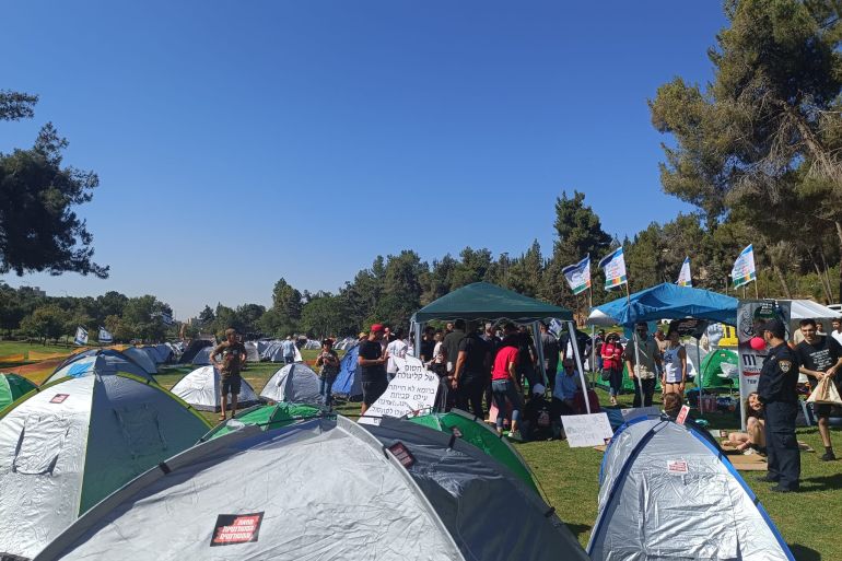 Around the well-maintained park grounds by the parliament on Sunday, the makeshift “tent city” saw more amenities under construction, such as large shades being built as the temperature in Jerusalem is hovering around 35C (95F) in the middle of the day this week.