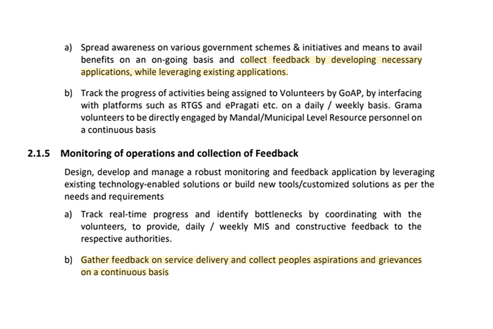 The government floated a tender in November 2019 to hire a field operations agency (FOA) to “design, develop and manage” a robust technology-enabled application to “gather feedback on service delivery and collect people’s aspirations and grievances on a continuous basis” and analyse the data collected by the volunteers.