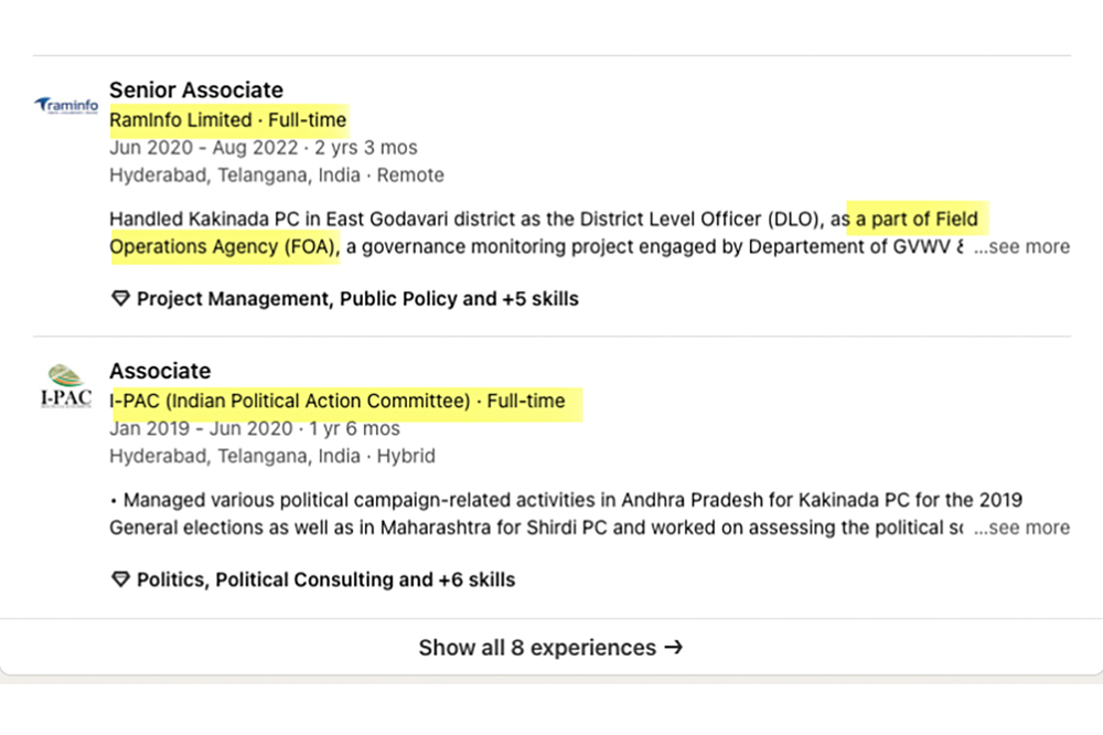 LinkedIn profiles of several FOA coordinators show they were hired from a political consultancy firm called the Indian Political Action Committee, or IPAC, an old strategist for the YSRCP.