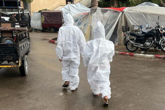 Rafah, Gaze Strip – Running out of options and solutions, parents in Gaza have resorted to putting their children in the white medical coveralls that were part of COVID-19 PPE kits, in a desperate bid to keep them warm and dry.
