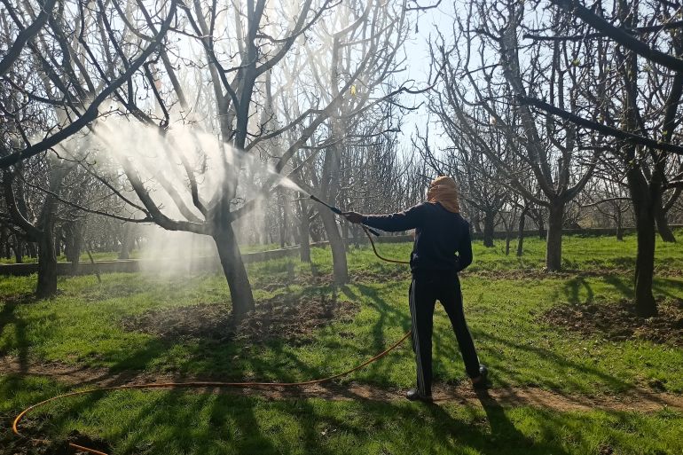 Since the officials’ visit, Shafi’s 1,500 sq metre (16,145 sq ft) apple farm has been deserted. Buds have formed on the branches, trees are mulched and it is time to spray them with pesticides.