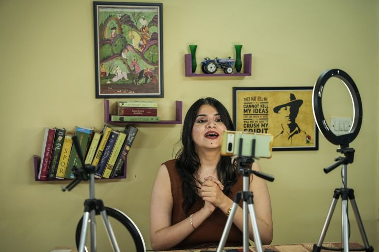 New Delhi, India – It is close to midnight. Ruchika Sharma sits in her makeshift studio at her home just outside India’s capital, New Delhi, a small mic hooked to her shirt. The 33-year-old historian and former professor is getting ready for her latest YouTube video show.