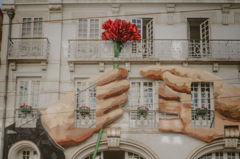 All over Lisbon, there are red carnations painted on murals, displayed on posters, visible in shops and worn by people. On an electricity pole close by, someone has shared a question on a poster for the 50th anniversary: “E depois?”(“And then what?”)