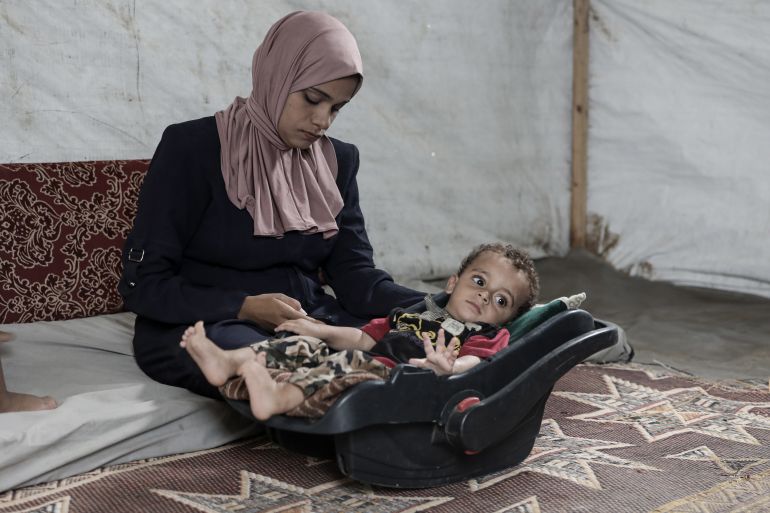 Al-Zawayda, Gaza – Inside a tent near al-Zawayda town in central Gaza, 35-year-old Nevin Abu al-Jidyan sat on the floor next to her youngest child, Abdul Rahman, who lay in a plastic baby seat.