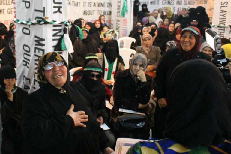 About 150 women in Idlib province met in the cellar of a building they had embellished with banners calling for freedom and Syrian revolutionary flags.
