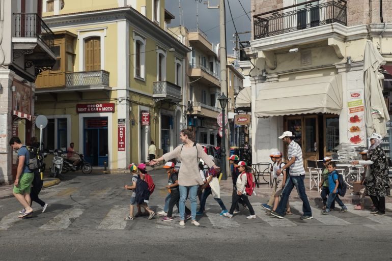 Chios, Greece – A group of Syrian children walk along the pavement and make their way to school. With each coffee shop they pass, they cheerfully shout “Kalimera” – Greek for “Good morning” – in unison.