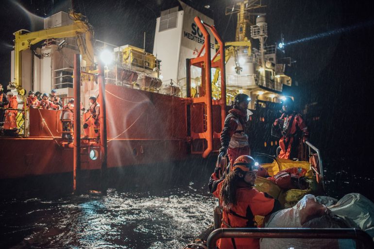 MV Aquarius braves cold and stormy weather to search for and rescue troubled refugee boats crossing the sea at night.