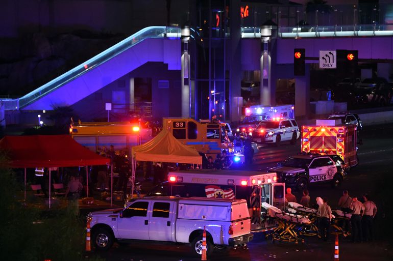 At least 50 people were killed and more than 400 injured when a gunman opened fire at a country music festival on the Las Vegas Strip on Sunday, raining down bullets from the 32nd floor of a hotel for several minutes before shooting himself dead, according to police.