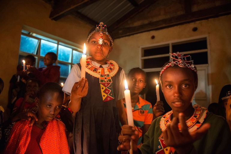 Magadi, Kenya – Girls in colourful dresses dance and sing while holding candles that light up their smiling faces.