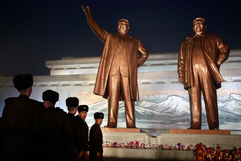 As snow fell Sunday, tens of thousands of people offered flowers and paid respects to the late leader at Mansu Hill Grand Monument in central Pyongyang, the location of huge bronze statues of the “Dear Leader” and national founder Kim Il Sung.