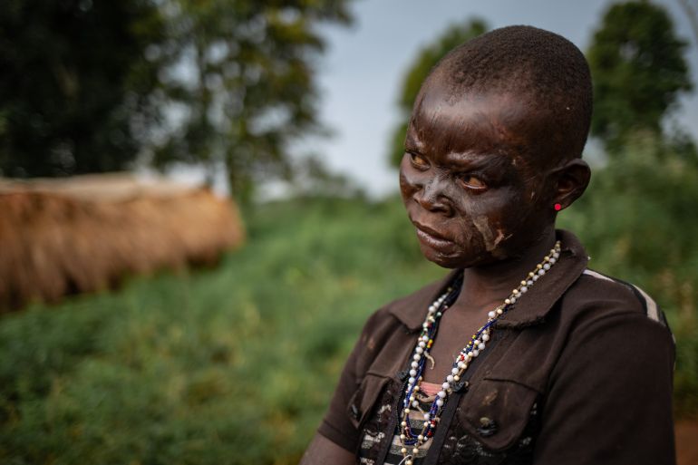 Ituri province, Democratic Republic of the Congo – Severely burned to the face and body, Anne is looking on what is left of the charred houses in her village.