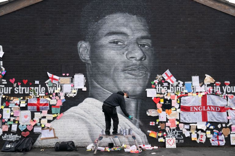People in England have stepped up to defend footballer Marcus Rashford by covering the racist abuse scrawled on a mural to the Black player in his hometown with messages of love and support for a “hero” who they said was a national role model.