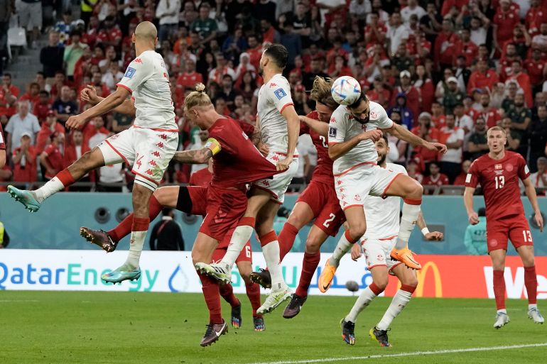 Denmark thought they should have had a penalty in stoppage time for handball that was checked at the VAR screen by referee Cesar Arturo Ramos, but he instead gave a free kick to Tunisia for a foul in the build-up.