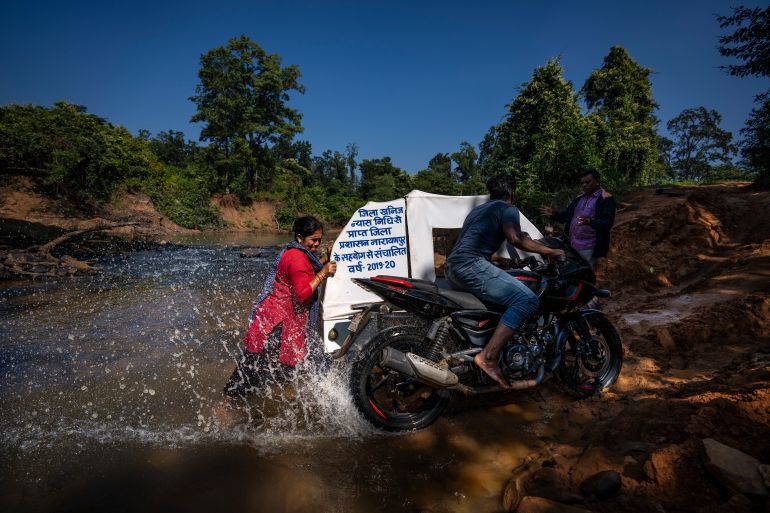 After 40 minutes of digging and a push to lift the vehicle from the river bed onto the muddy path, the team was on its way again. The bike ambulance resumed its 14.5km (9-mile) trek across the forest known as Abhujmarh, or the “Unknown Hills”, to reach 23-year-old Phagni Poyam, nine months pregnant in the isolated village of Kodoli.
