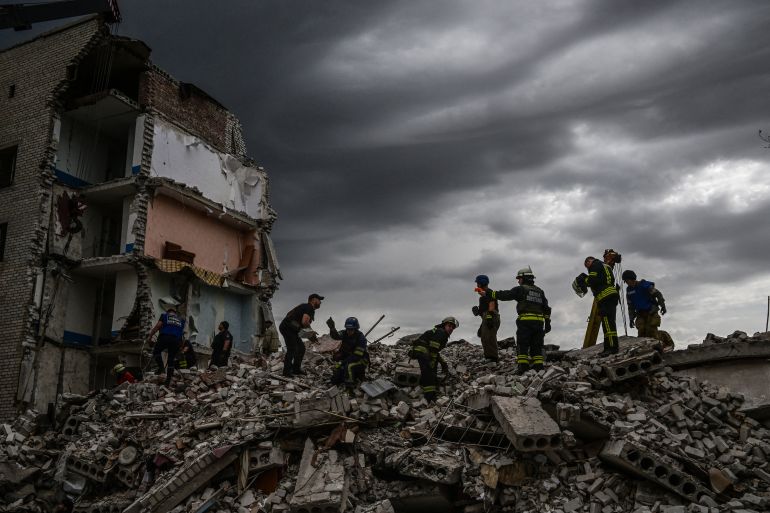 Emergency workers in eastern Ukraine continued to search for survivors in the ruins of three buildings that were hit in a Russian rocket attack in the eastern town of Chasiv Yar.