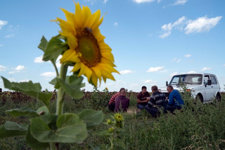 Some farms in the area have been luckier. Nearly 10km (6 miles) to the southwest of Novomykolaivka, a combine harvester moves methodically up and down a field, slicing dried sunflowers from their stalks and pouring their black seeds into waiting trucks.