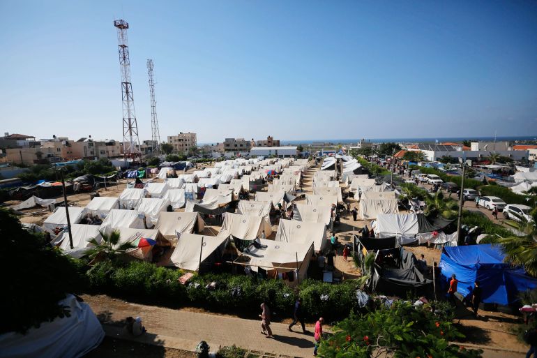 Hundreds of tents have been set up in Khan Younis, aligned in neat rows, for the thousands of recently displaced Palestinians who have fled the indiscriminate Israeli bombardment over their homes in the northern Gaza Strip.