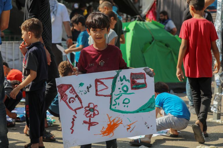 Gaza City – Dozens of children gathered around each other, jostling and comparing their artwork, an incongruous sight in the middle of a sea of makeshift tents set up for displaced Palestinians in the courtyard of al-Shifa Hospital.