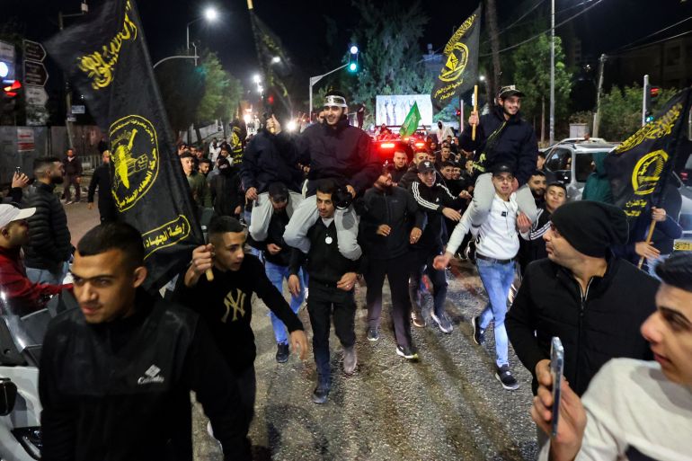 A bus carrying the Palestinian prisoners was welcomed in the occupied West Bank city of Ramallah, where dozens of men, some holding green Hamas flags, greeted them.