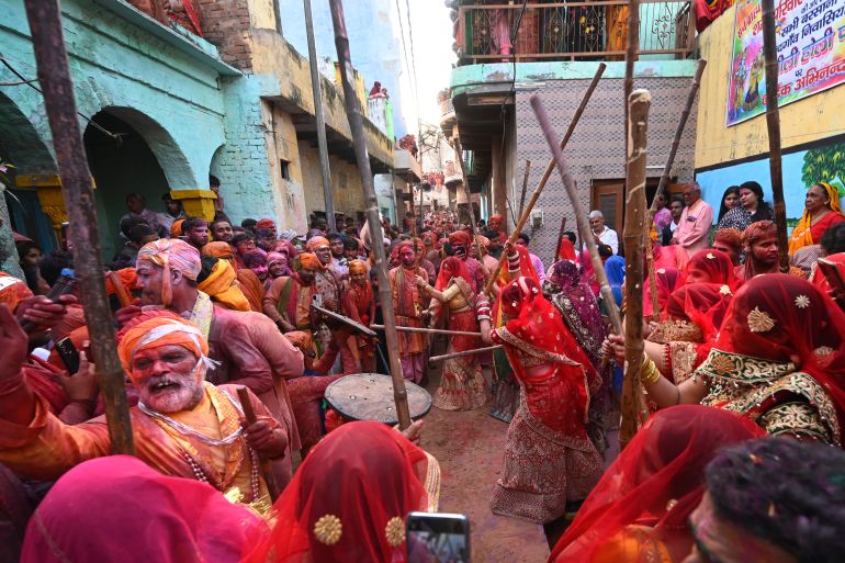 The women were from Nandgaon, the legendary hometown of Krishna, and the men were from Radha’s hometown of Barsana – twin towns about 115km (70 miles) south of the capital New Delhi.