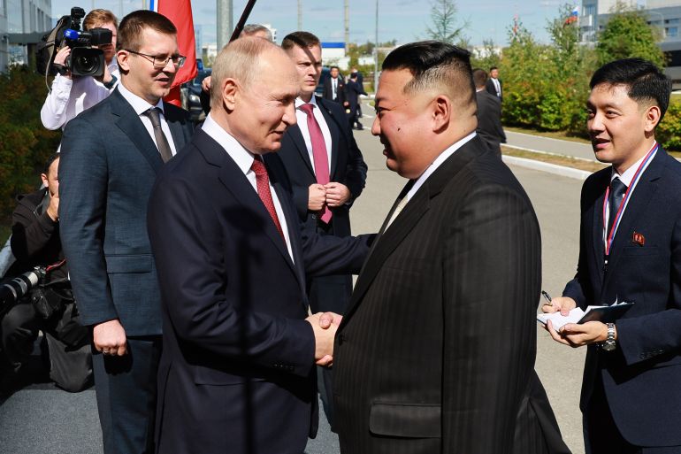 ![Kim arrived at the meeting in a limousine that was brought from Pyongyang on his special armoured train. [Sputnik/Mikhail Metzel/Reuters]](https://www.aljazeera.com/wp-content/uploads/2023/09/33V48HN-highres-1694600777.jpg?fit=1170%2C780&quality=80)